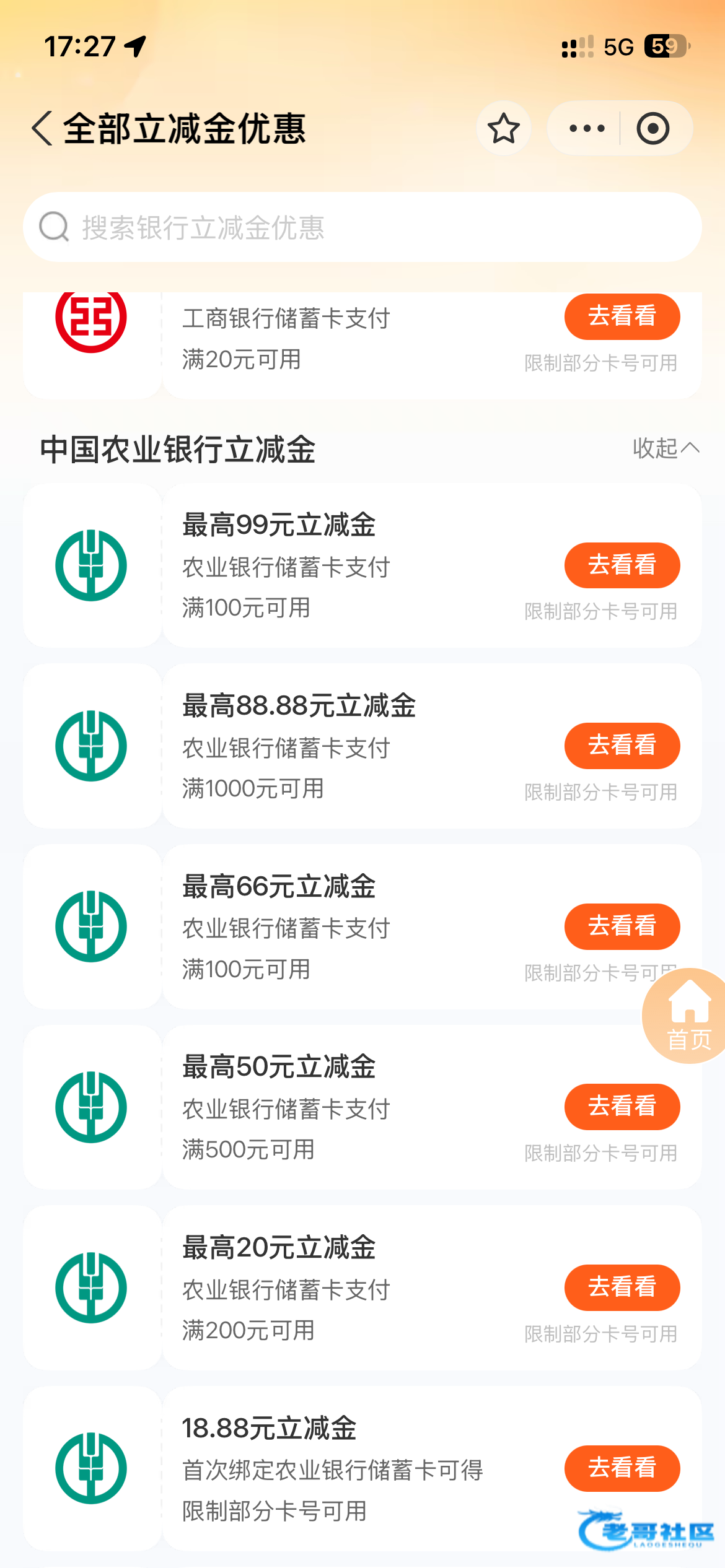 然后打开支付宝APP,搜索立减金、立减金选择农业银行。找到10元区首绑 623053080 开头的