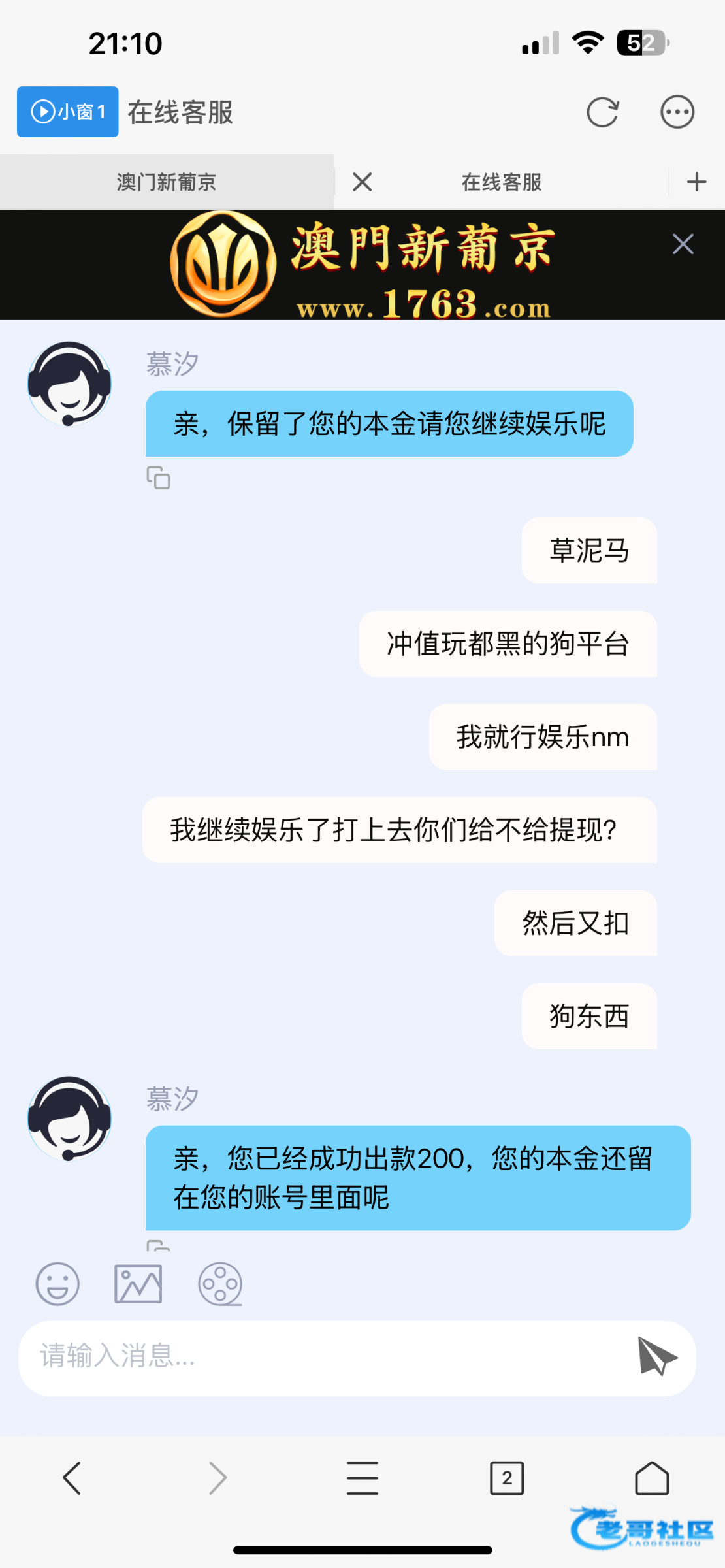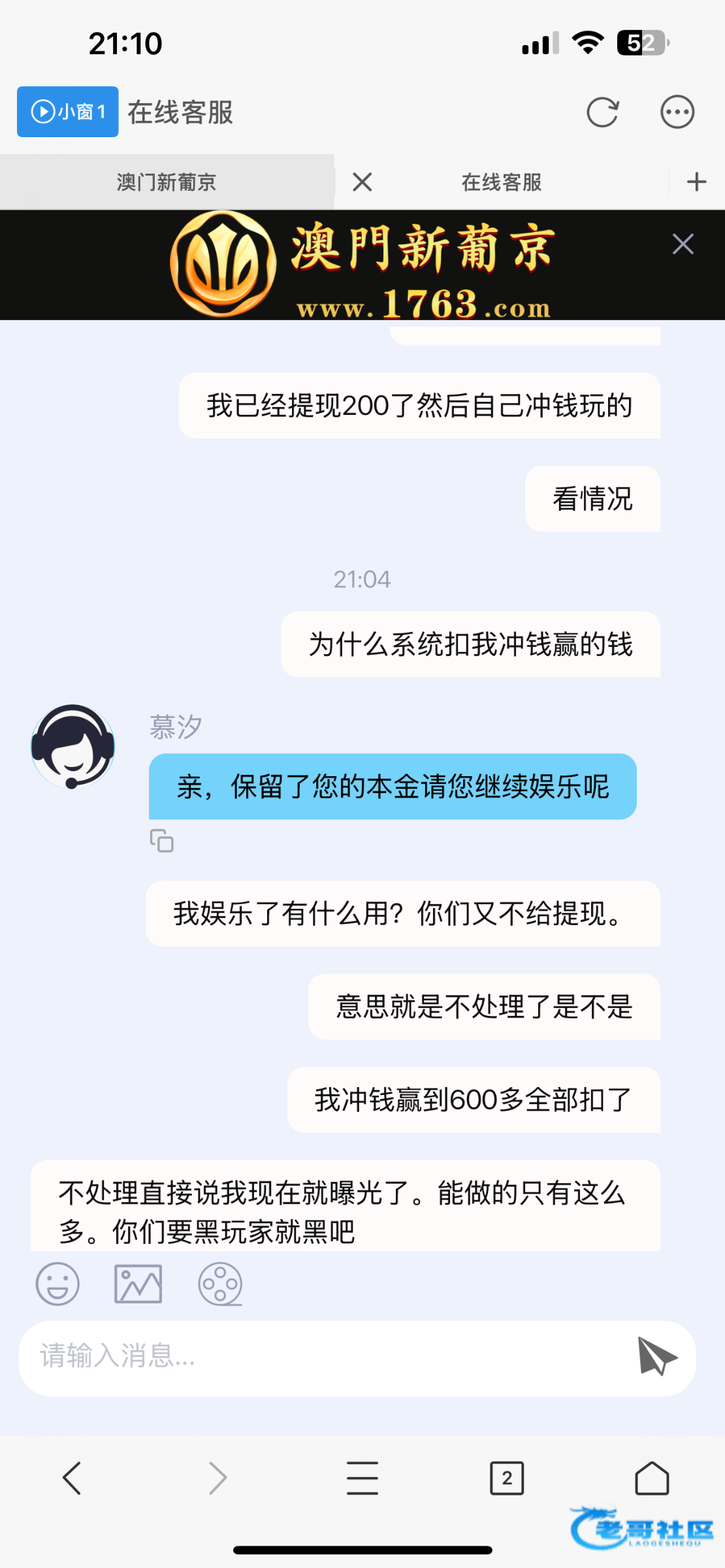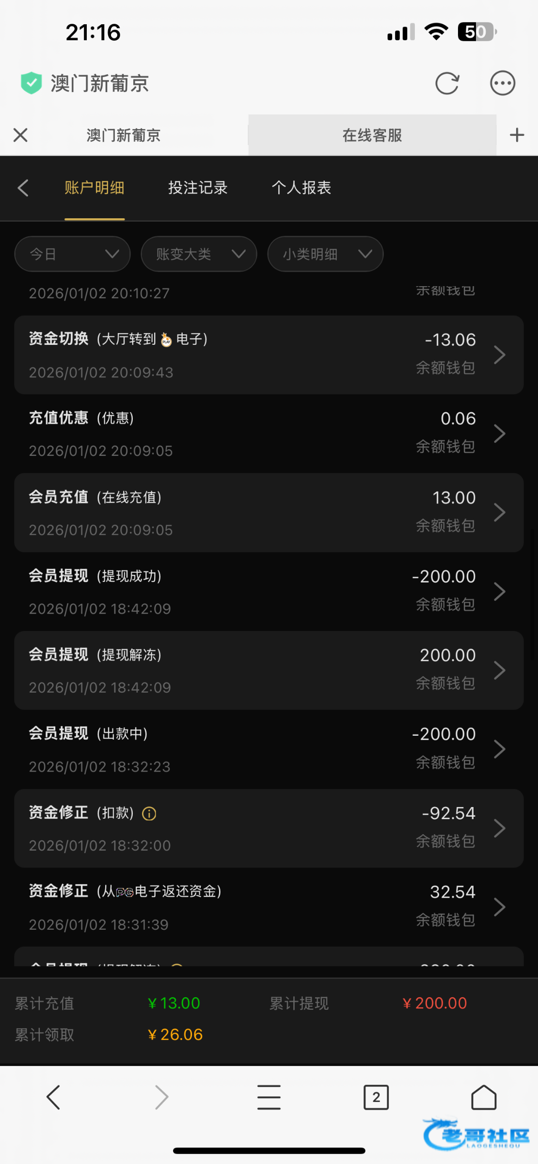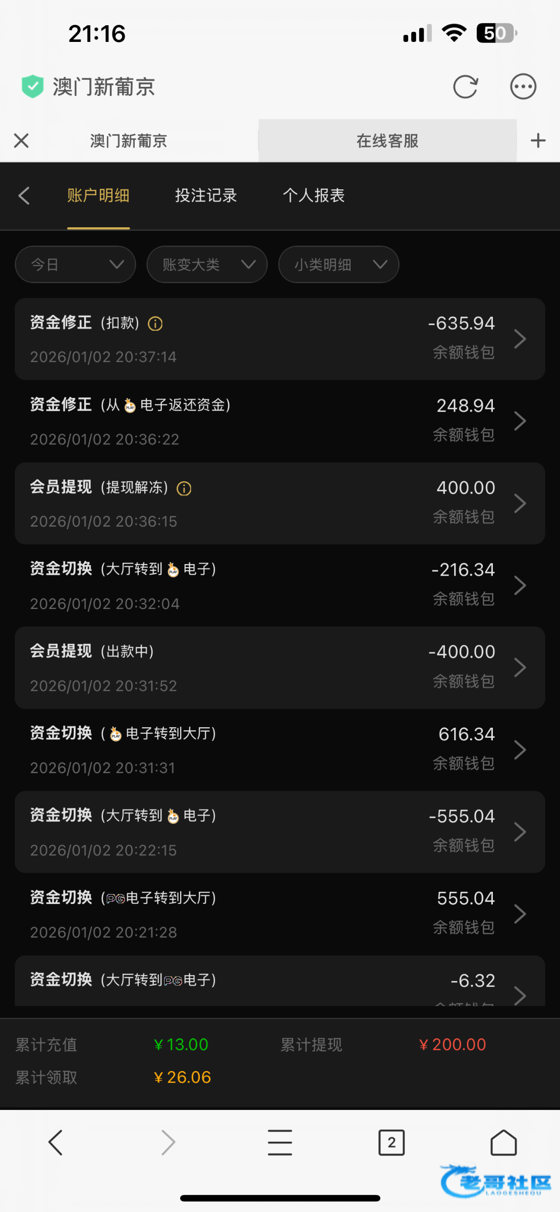 我一开始领取的26彩金,打到300多提现200剩下的全部扣了,然后我账户¥0的情况下我自己冲13玩一下,打到600多,想提现400继续玩然后直接全部扣了,冲钱玩的黑的理由是我领取了短信彩金,短信彩金都是我去年11领取的,无限重复这句话,牛比,老哥们注意一下吧白嫖不要冲这个平台