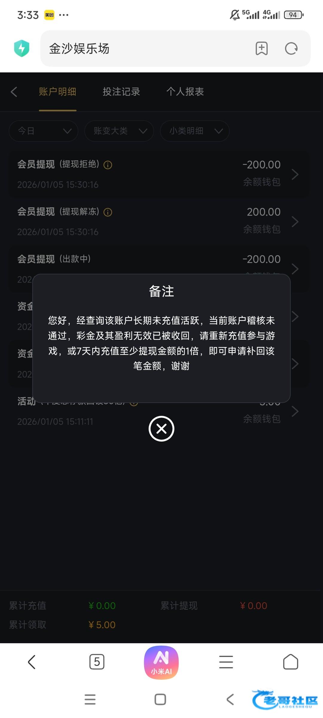 3833前面充值3千+,1个月没充,今天领的回馈,打到30提款,直接没收,送了3000,提他30不让提,这种畜生台
