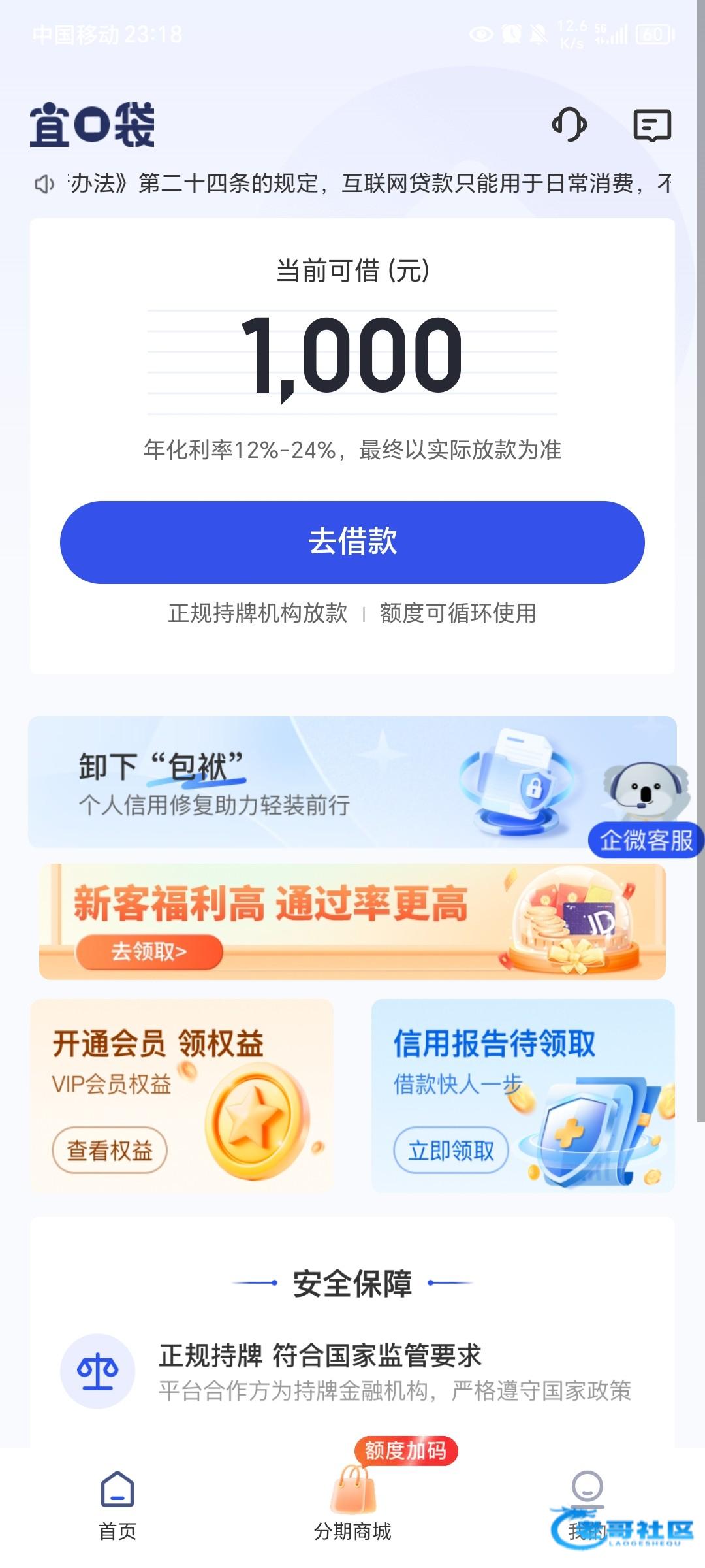 申请了一下,只显示购物额度,有借款额度但是首页看不到