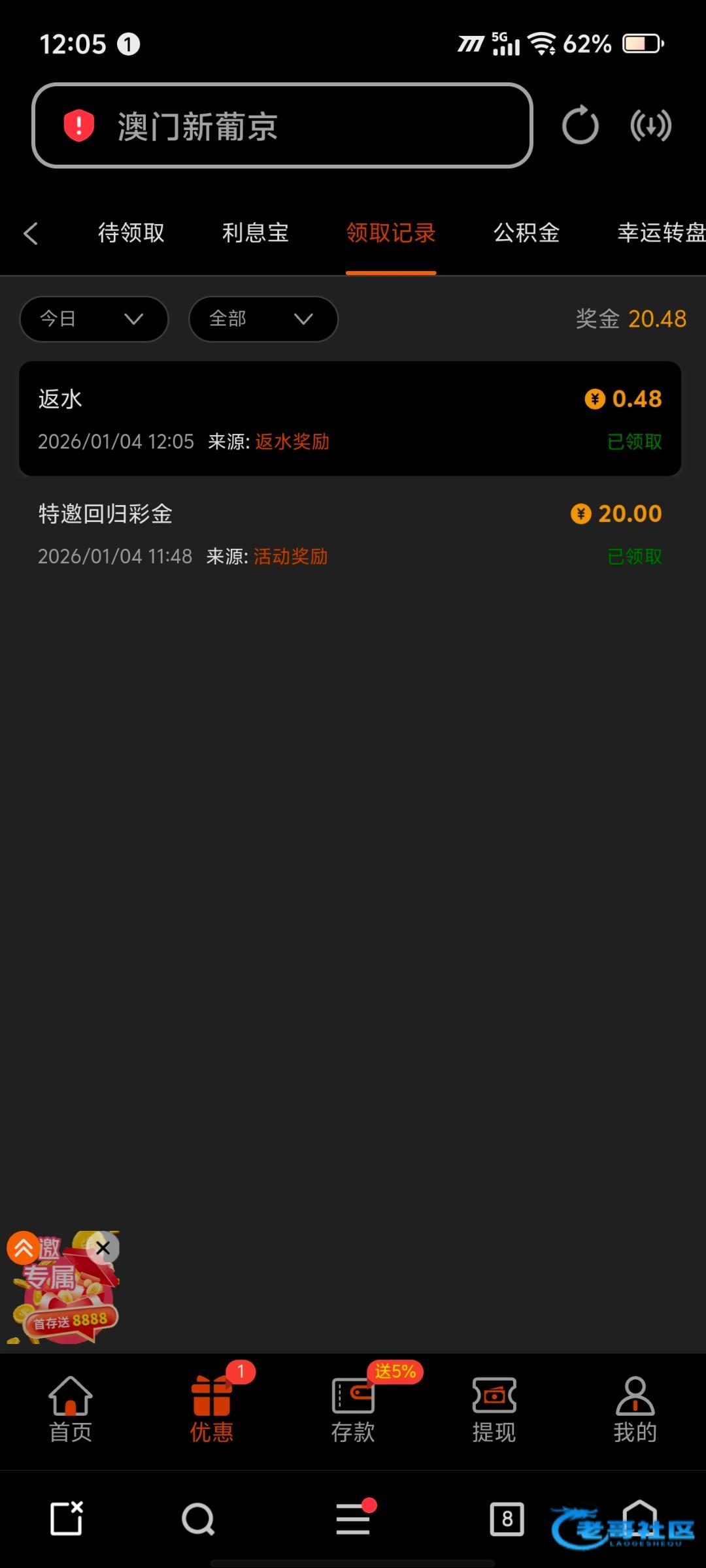 上次也是收到特邀20打上1000,就充了100,进去0.20拉了一会,提现秒到