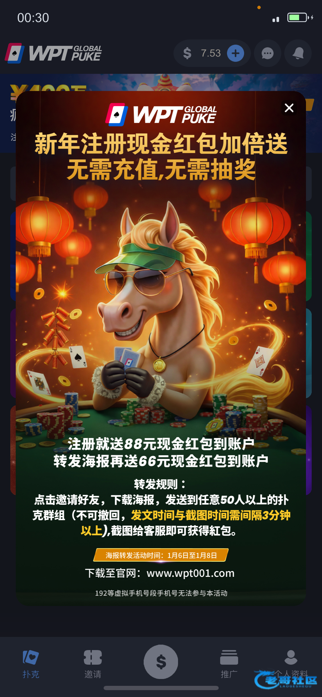 前面老哥发的那个注册送7u的 分享邀请好友的图片在群里截图给在线客服另外还送7u 还送4张门票网站wpt001.com