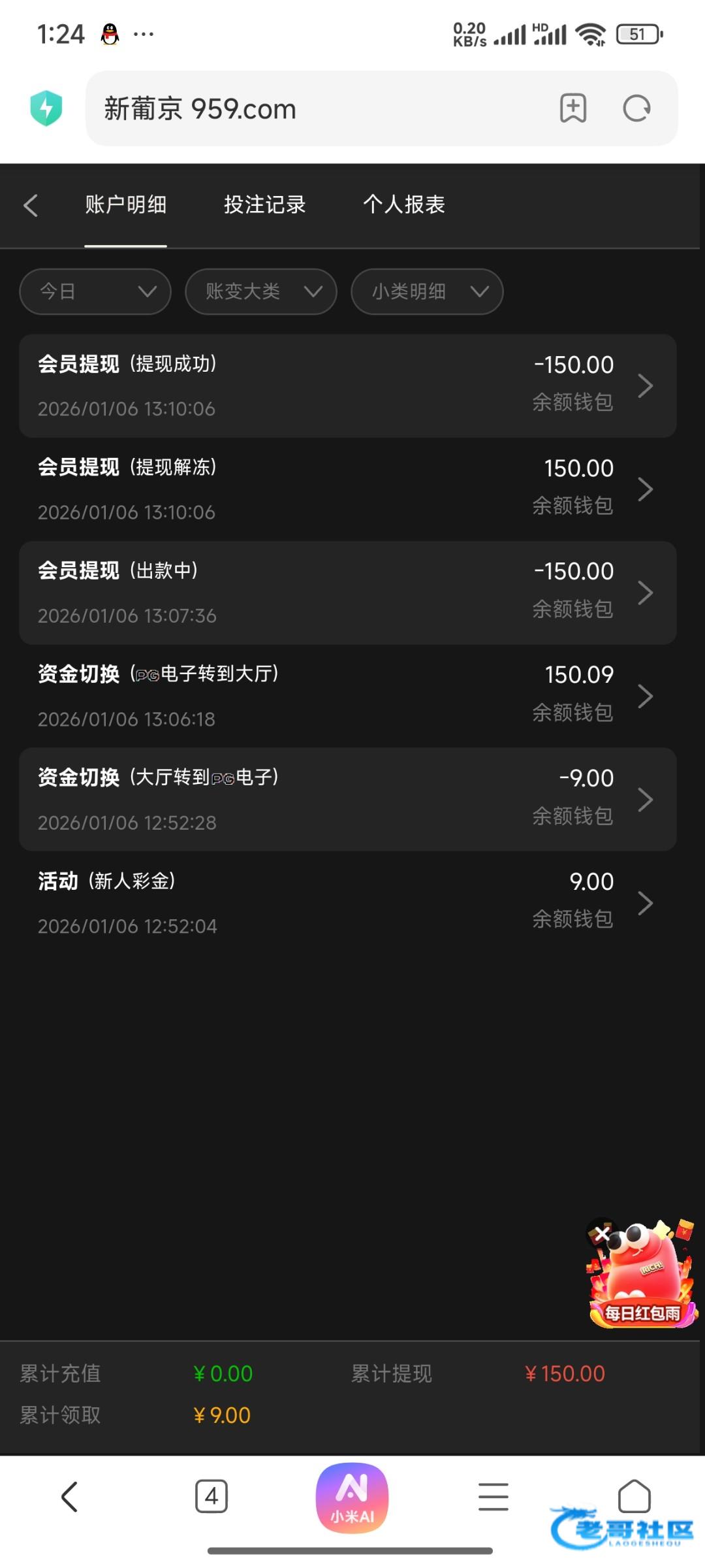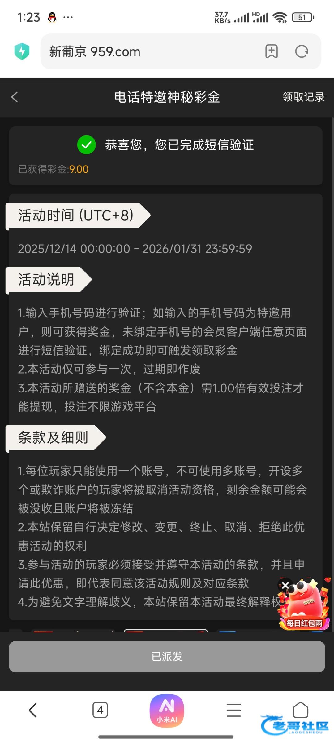 电话彩金送9还行,有点水用手机号注册就自动送了链接959.com
