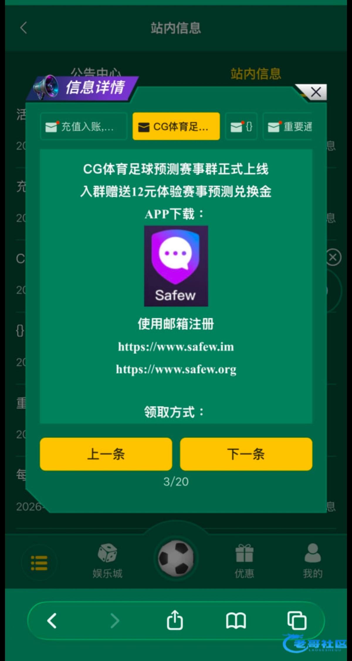 hm20338.com 幻影/CG老会员登陆会员帐号,查看内信截图,找专员领取就可以,限定打专员指定足球球赛预测
