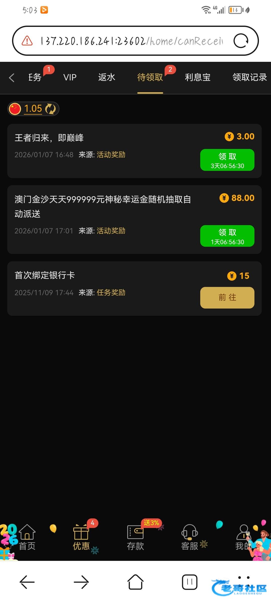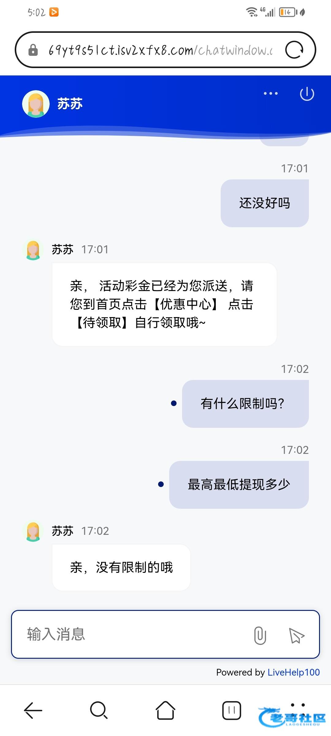 傍晚打电话过来说有彩金领 上号没有我把电话里面那个女的骂了 后面让我找客服 客服说过期了 我就扯皮 说过期了才给我打电话 然后让客服补回来给我 打上150去打真人挂逼了 可以去看看有没有 也可以去碰瓷 链接995.com 不要充值