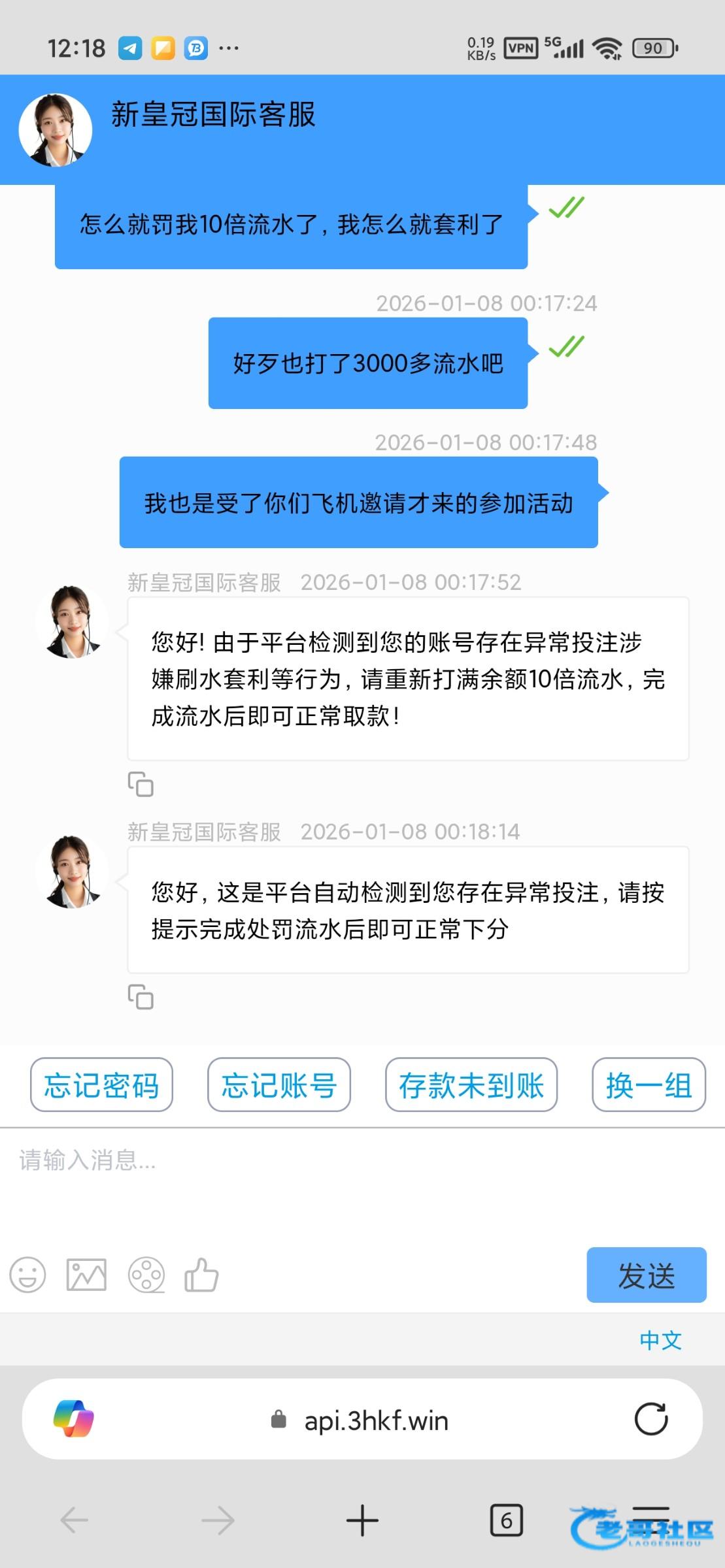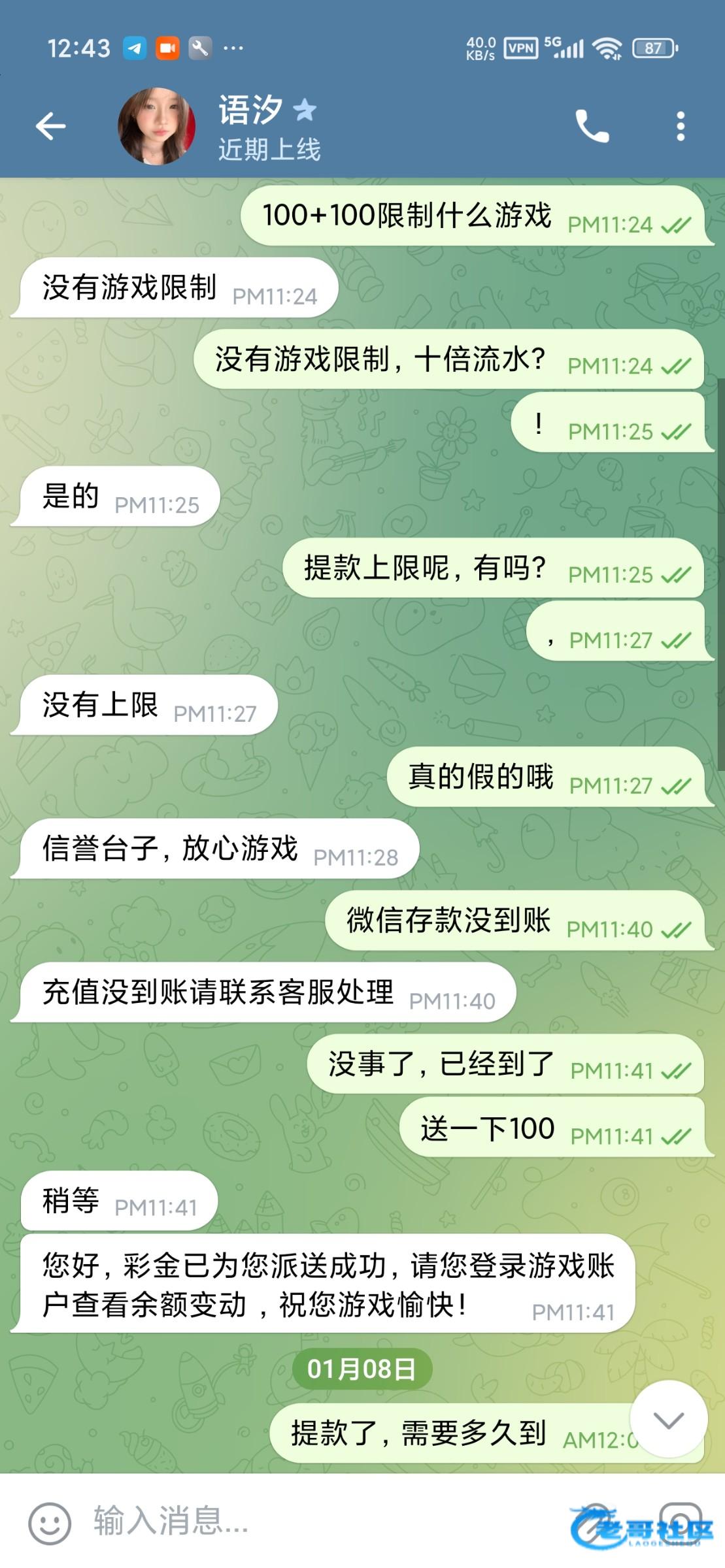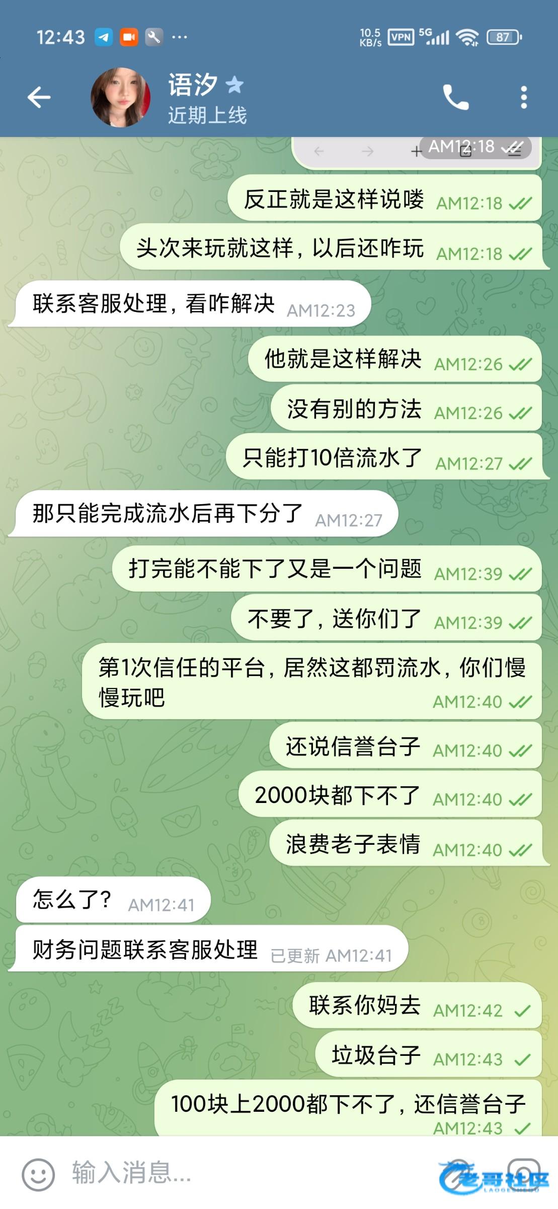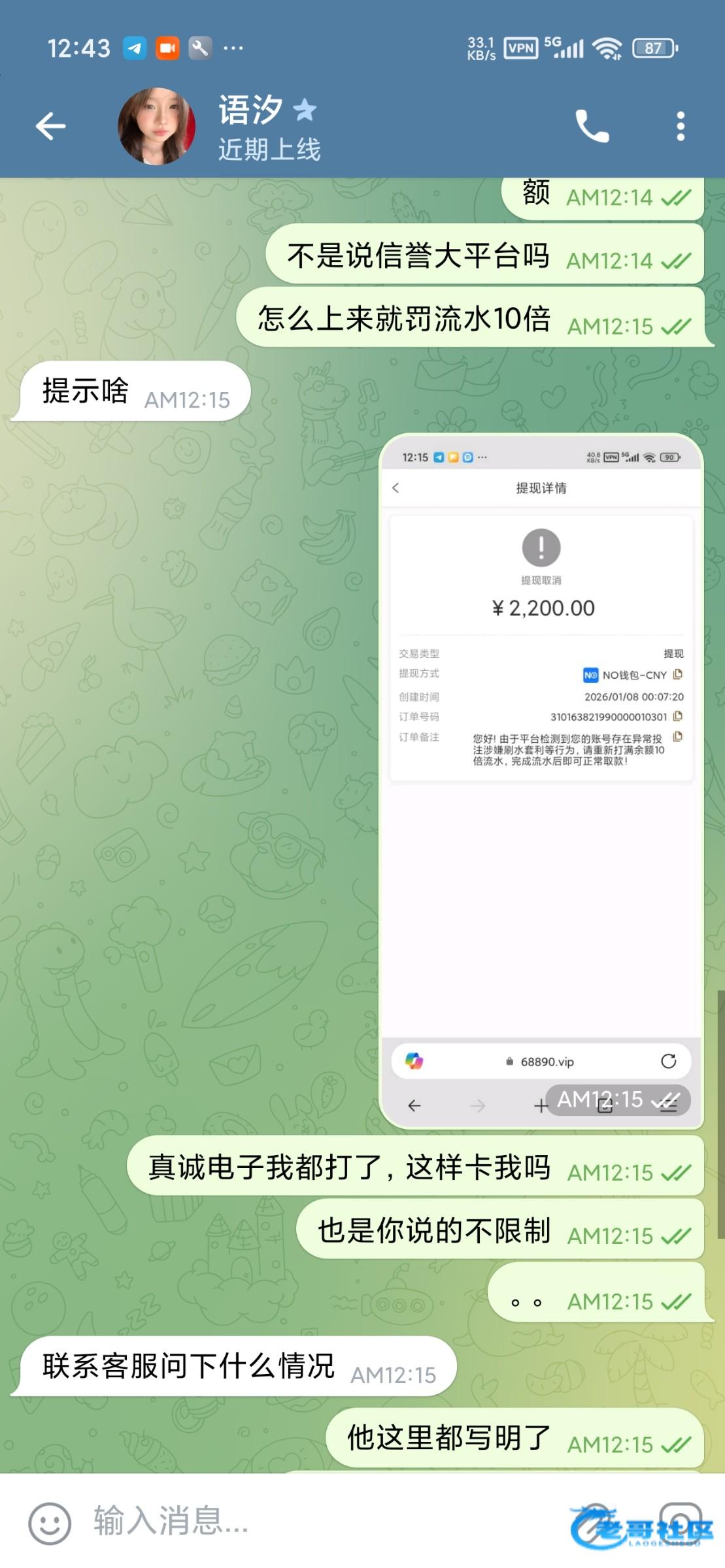 起因是在飞机看到了有人私聊说我皇冠回归送,我去注册了送了28没打出来 然后我又来论坛看了一下,有人白嫖出款了,应该小额没问题,我就去打了一下100送100,他说的10倍流水不限制游戏不限制提款,我打完流水3000多流水,提款2200直接退回来罚10倍流水。打电子打不上去又去真人过了两关,第3关失败了,也就意味着没打到,记住,以后这种就不要充值了,浪费表情就当送他100块钱买纸钱了,当时闲着没太知道就想打一下的,还信誉大台子,真给我看笑了