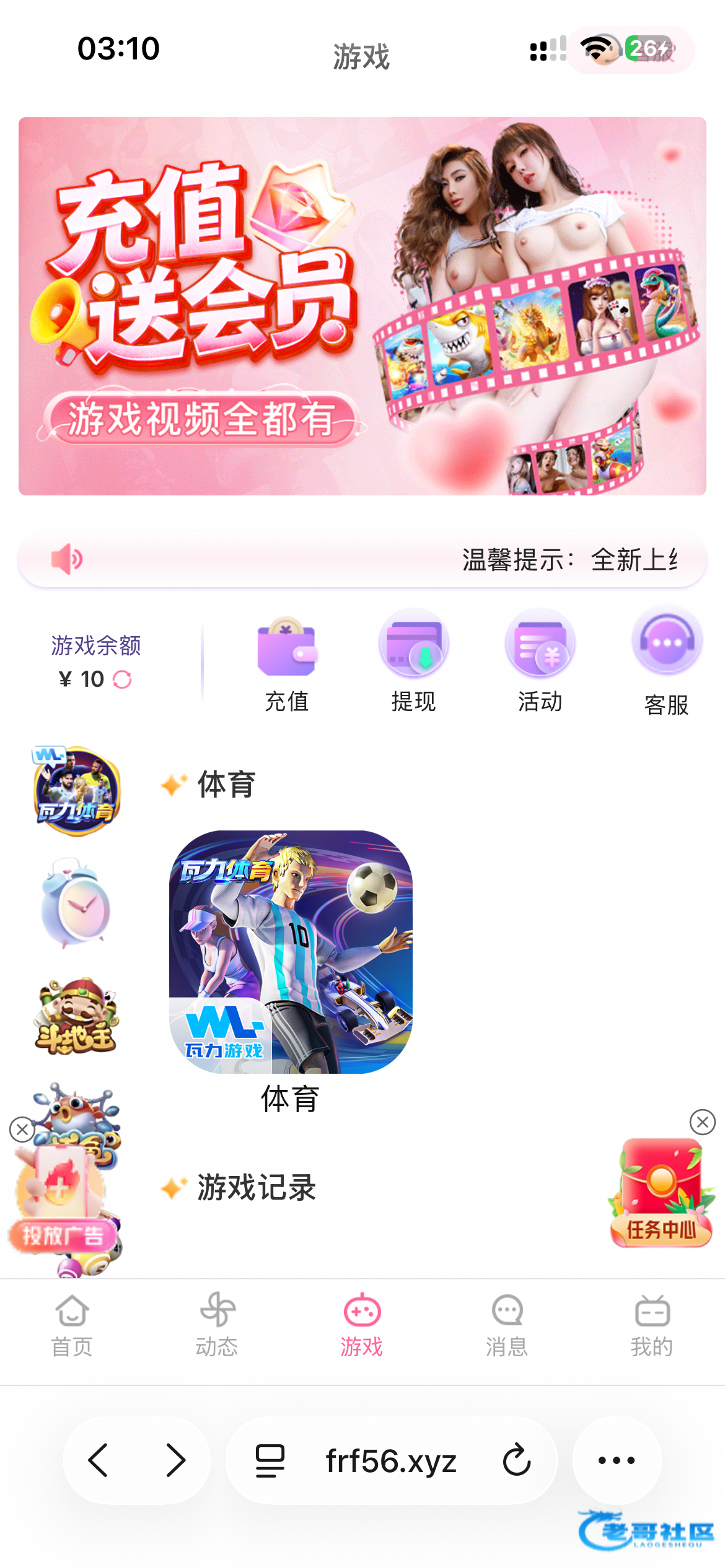 刷广告看见的 打开点游戏 然后注册送了10块 里面只有开元和瓦利游戏 我没打不出来不知道能不能出 赌神上 网址:https://bili123.xyz