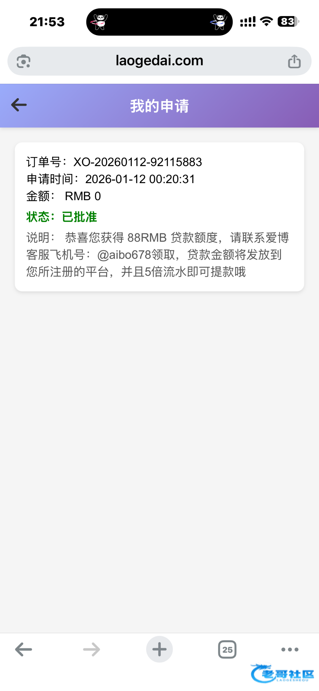 刚早就有人发过,下面说是骗号的外加楼主自己也没领到就删了,又有人一直发那就作为交流吧,你们自己注意点风险自理,还有老哥贷,跟本站没有任何关系。