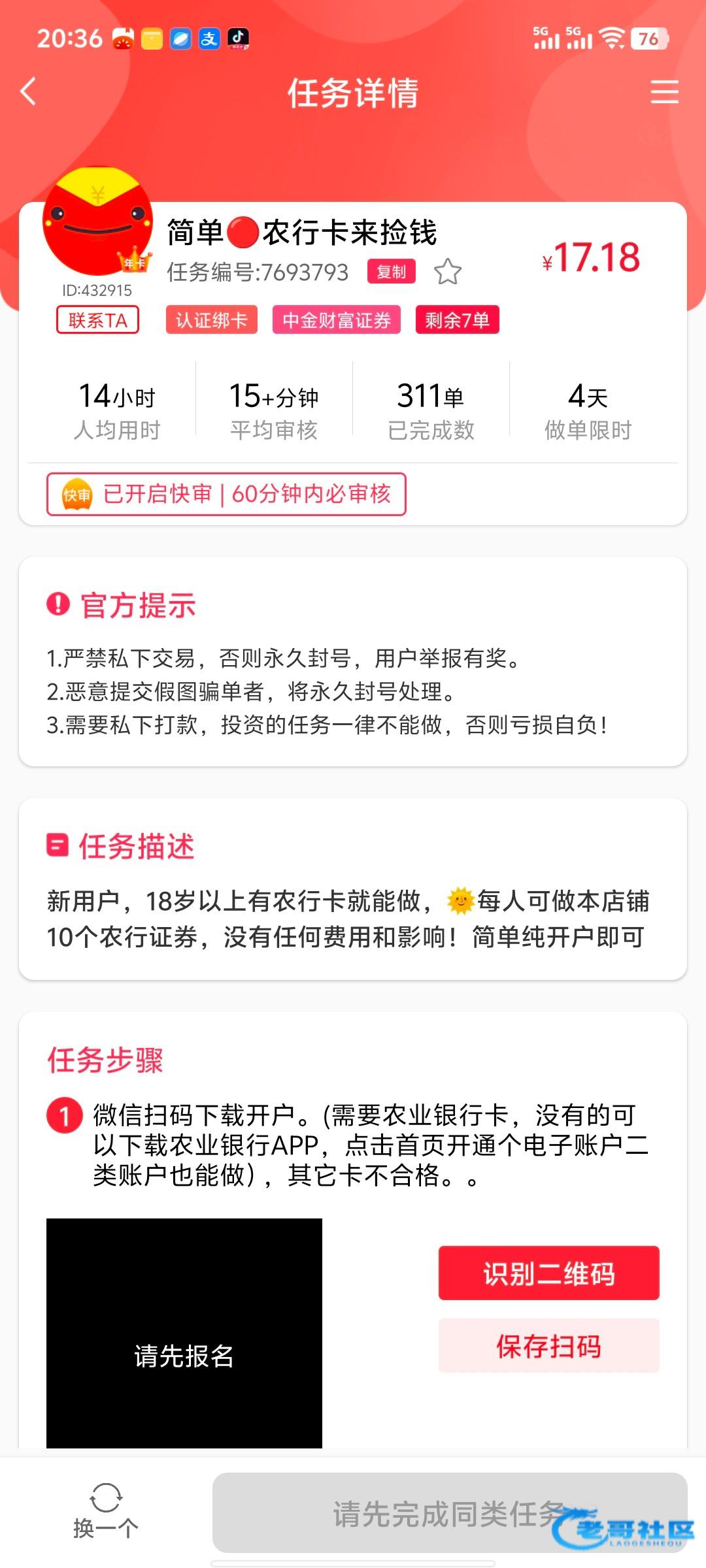 有农行卡的可以直接做,没有的下载一个农行APP开一个二类户做,一个卡可以做十单,平均一单15-20元,一单平均十分钟,我用的是赏帮赚做单,本人亲测到帐,没钱吃饭的老哥可以去弄一下,得吃的老哥反馈一下,混个有效帖