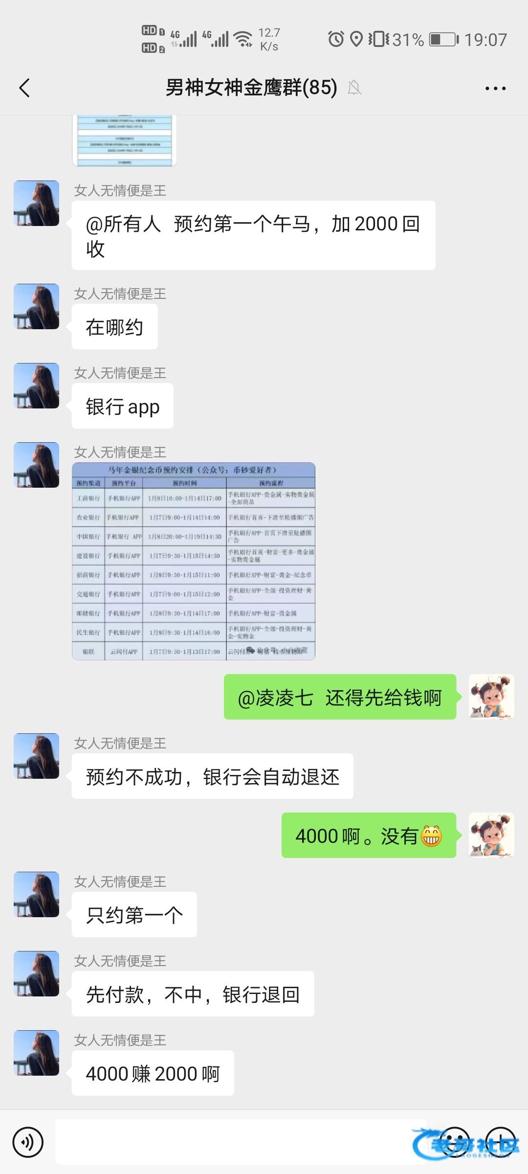 老哥们,稳稳的赚钱机会,今晚十点跟十点半可以预约马年纪念币和纪念钞,抢到直接卖掉最低利润300,好的号码上万都可能!一年就这一次把握住,很多银行app都可以预约!没钱的老哥可以直接在网上找黄牛,你帮他抢到他也直接给你钱!