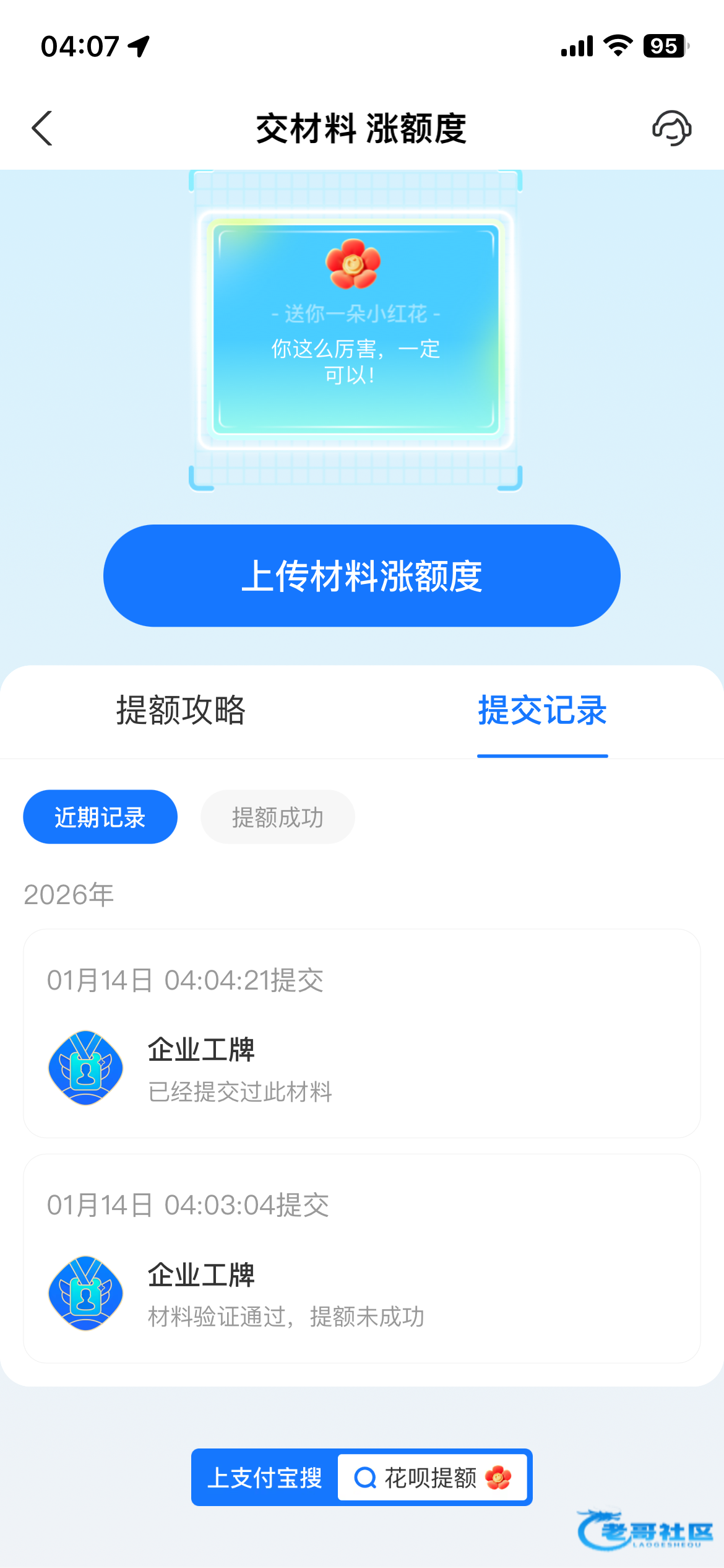 2026年1月14日凌晨2点,身上身无分文的我连买瓶水的钱都没有,到处找白嫖下载各大贷款软件,点到花呗突然看到有提额入口,有各种证明可以提交,最主要的是要有工作证明,我是用了3年前进厂发的厂牌,第二天我就跑路了一直留着这个厂牌没想到今天派上用途,上传后1分钟就给我发了2000额度,我支付宝一直都是50/100额度很多年了,一直提升不了,没想到今天终于升了,饿死了我要去买吃喝的然后上分打狗了,没钱的老哥去试试。