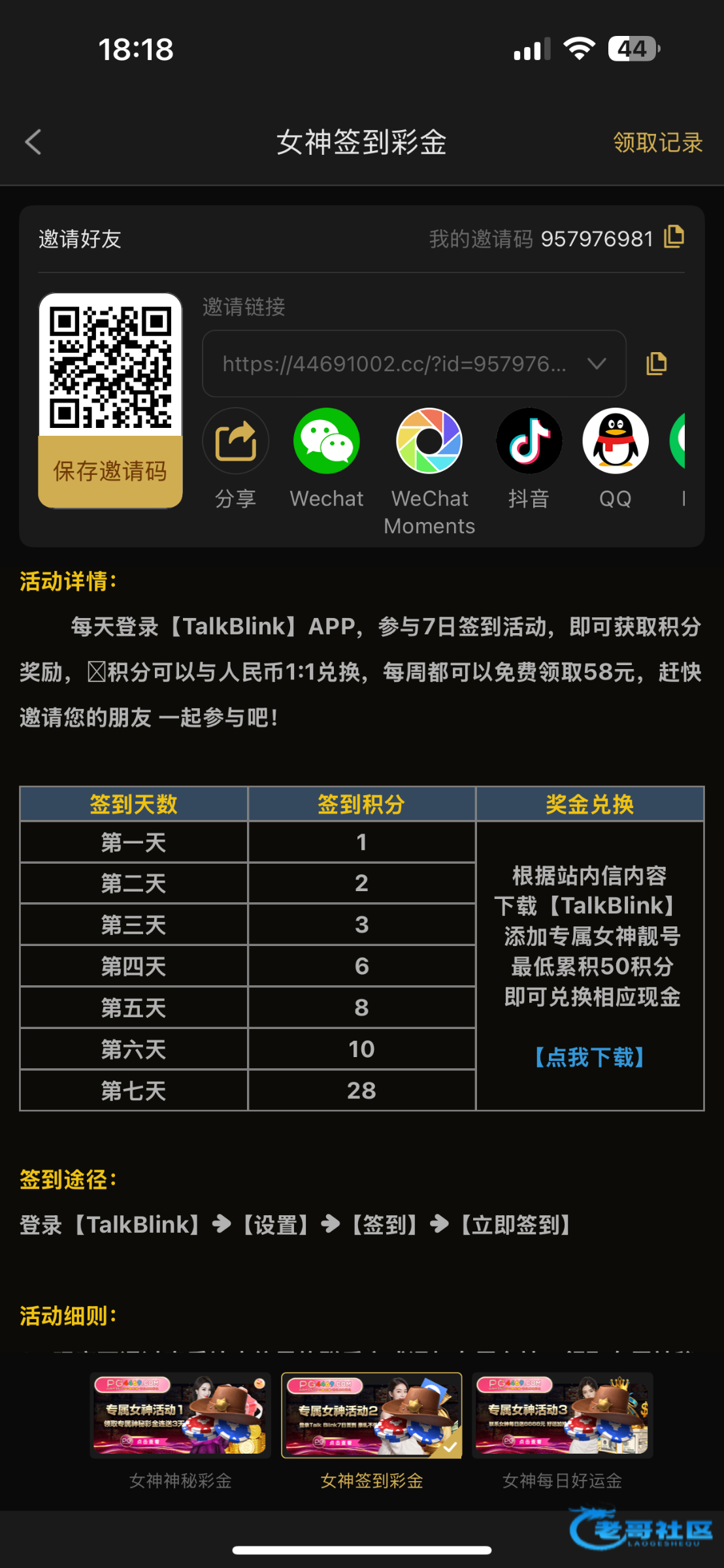 老哥们可以试一下去下载这个TalkBlink然后签到7天拿到58积分之后可以加客服换彩金兑换比例是1:1的。我朋友已经换了没有打出来。谨慎充值。链接是4469.com